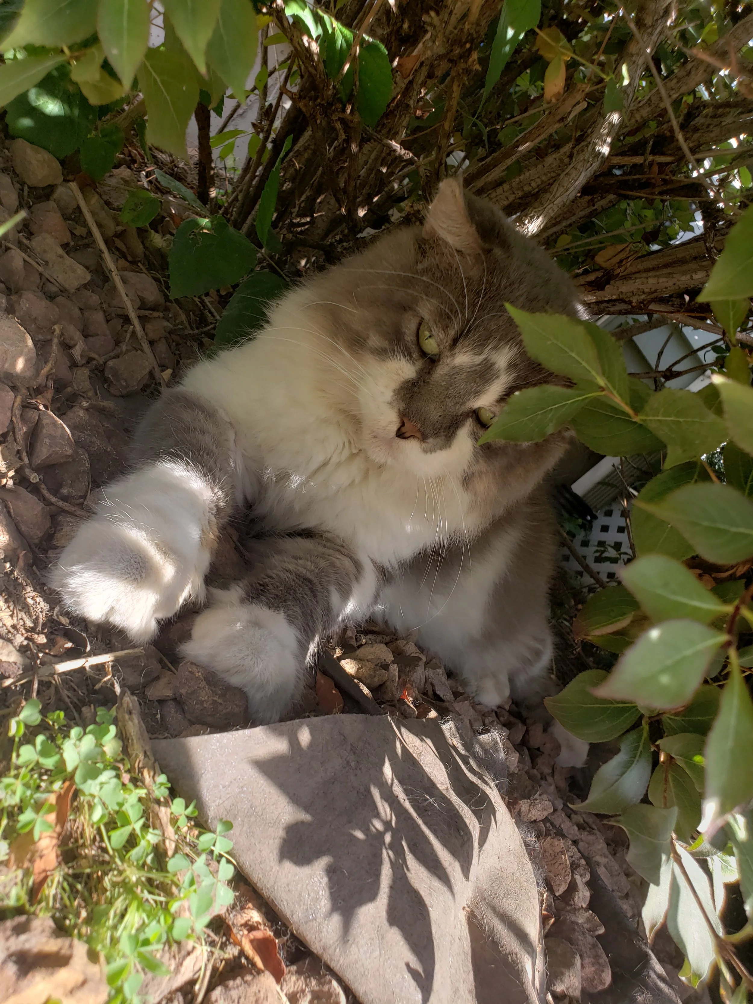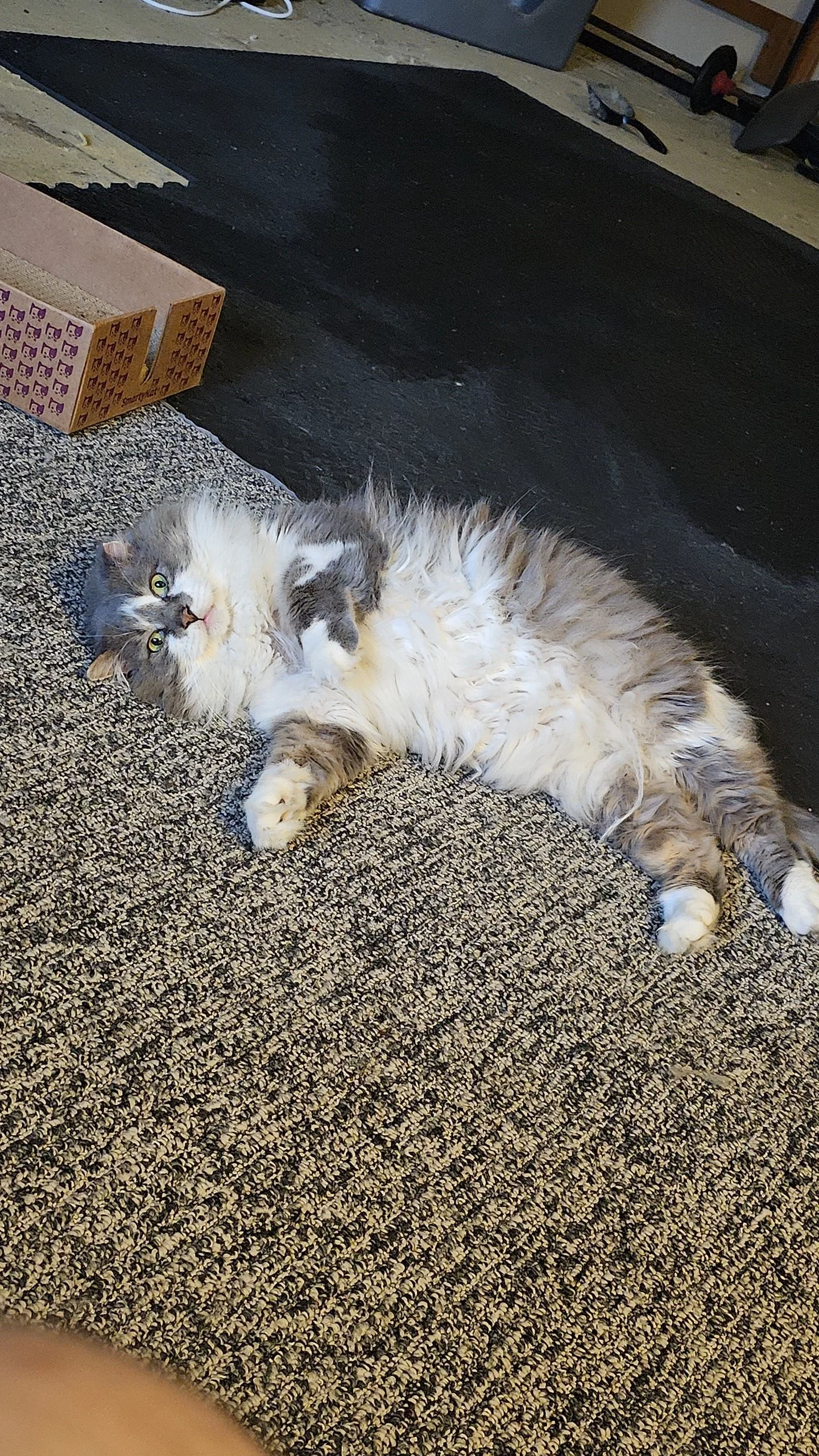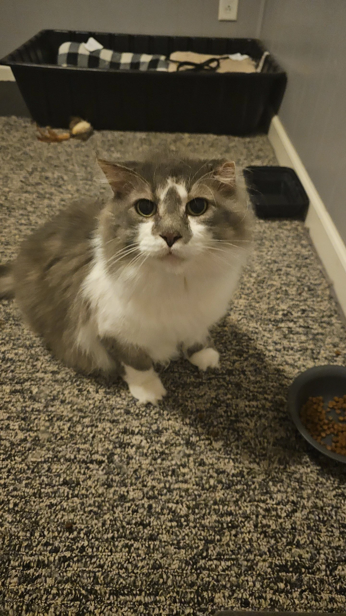 Unique personality traits: Fluffy is very much a chill guy who has been very happy to be off the street, but a little bit of the hardened street cat still comes through especially in how he sounds. His meows are very much more of "Meh" than they are a meow.